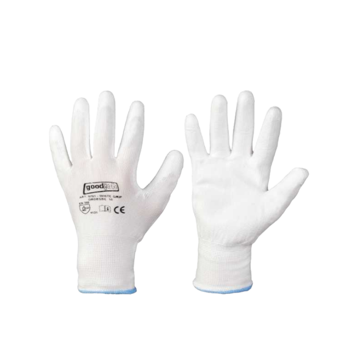 12 x Feinstrickhandschuhe mit PU-Beschichtung in weiß. Bitte bei Bestellung Größe angeben!